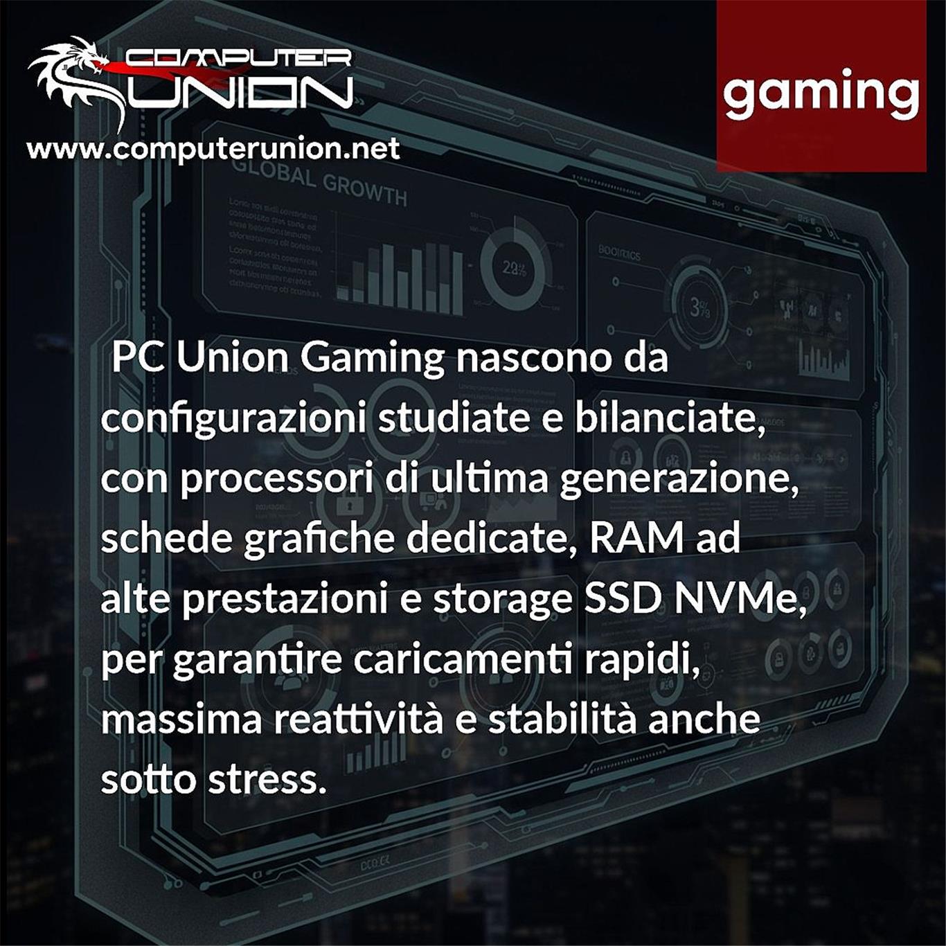 I PC Union Gaming nascono da configurazioni studiate e bilanciate, con processori di ultima generazione, schede grafiche dedicate, RAM ad alte prestazioni e storage SSD NVMe, per garantire caricamenti rapidi, massima reattività e stabilità anche sotto stress.
