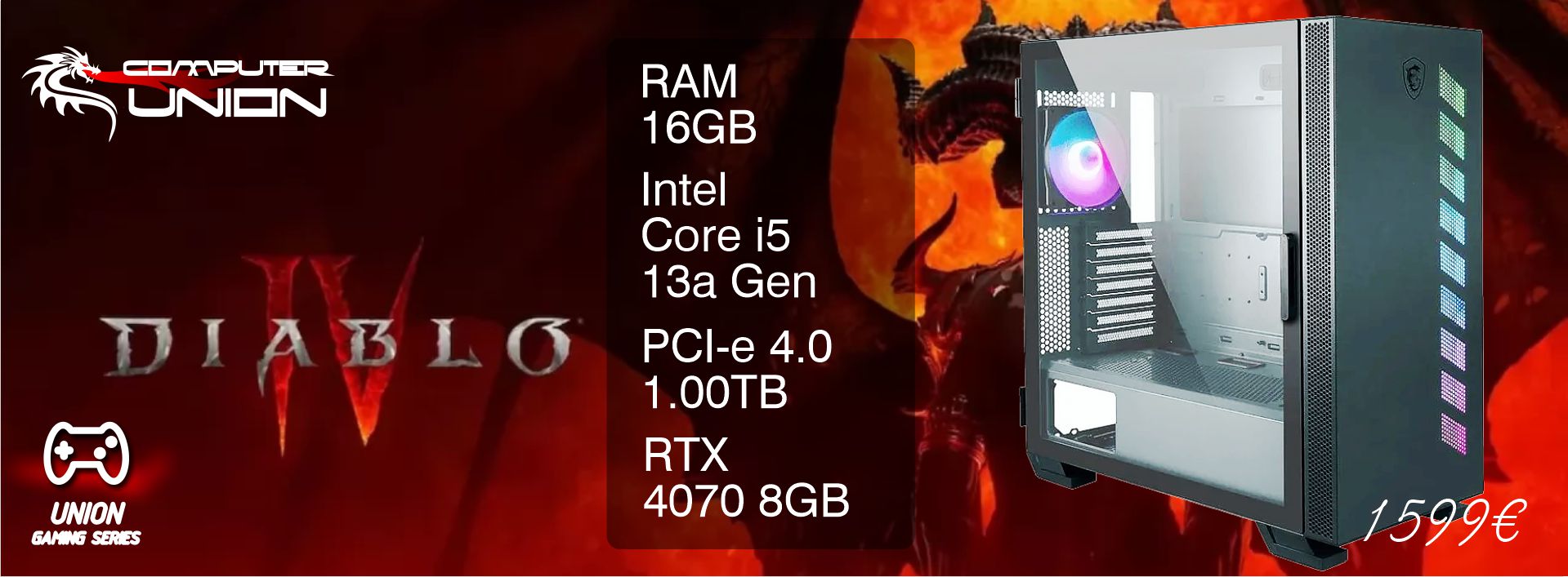 E' dotato di scheda video NVIDIA RTX 4070, processore, Core i5 di 13a gen ed SSD da 1TB per un'esperienza di gioco performante.